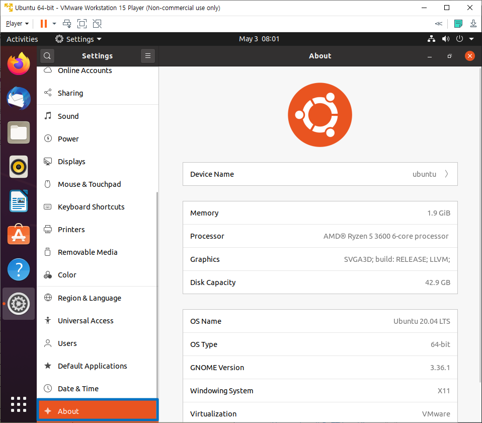우분투[ubuntu] Settings 메뉴의 상위 메뉴에서 가장 밑에 있는 [About]부분을 클릭하여 주시길 바랍니다. 여기에 보시면 OS Name 부분을 보시면 현재 사용하고 있는 우분투[ubuntu] 버전 정보를 확인할 수 있습니다.