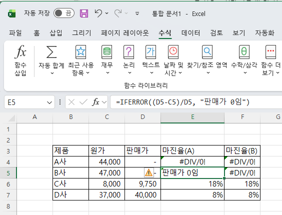 판매가가 0이거나 비어 있는 경우 #DIV/0! 오류가 발생할 수 있습니다. 이럴 경우에 사전에 방지 해야합니다. 그러기 위해서 다음과 같이 IFERROR를 사용하면 깔끔하게 처리할 수 있습니다.