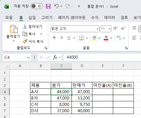 엑셀[Excel] 마진율(마진률) 계산방법, 마진율 공식(마진률) 본문