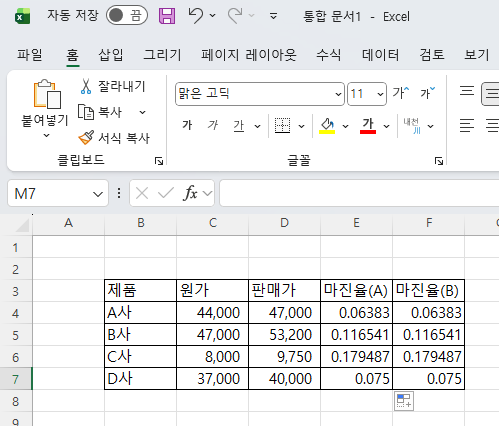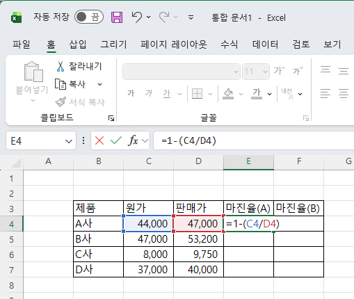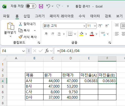 위에서 보이는 바와 같이 마진율(A)에서는 1에서 원가를 판매가로 나눈 값을 빼줍니다. 그럼 마진율을 계산을 할 수 있습니다. 그리고 마진율(B)에서는 판매가에서 원가를 뺀 값을 다시 판매가로 나누어서 마진율을 계산할 수 있습니다.