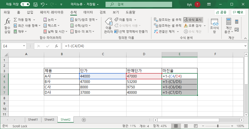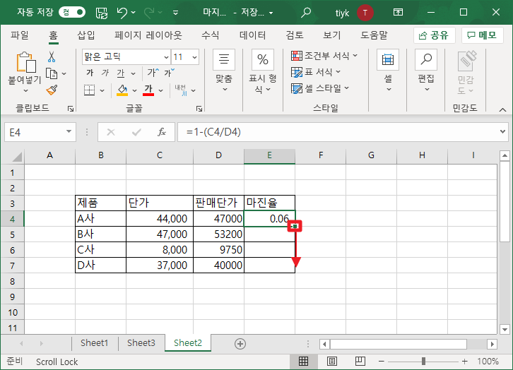 위에서 보이는 바와 같이 1에서 단가(매입단가)를 판매단가로 나눈 값을 빼줍니다. 그럼 마진율(마진율)을 계산을 할 수 있습니다.