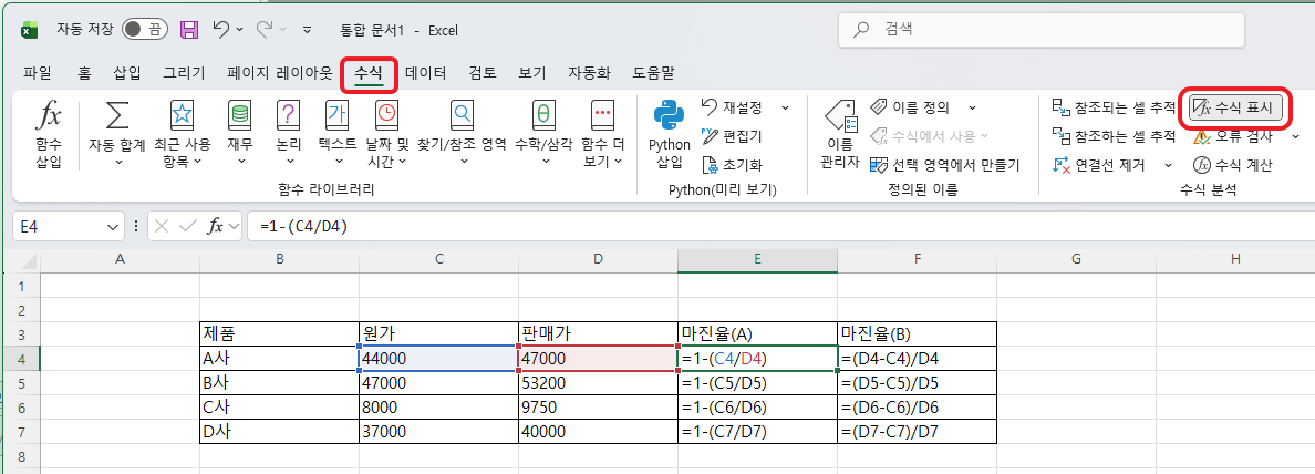 그럼 이 부분이 적용된 수식을 한번 봐보도록 하겠습니다. 상위 탭에 [수식]에서 [수식 표시] 부분을 클릭하여 주시길 바랍니다. 그럼 수식이 입력된 모든 셀에 대해서 모든 수식이 표시가 됩니다. 마진율을 구하는 방식을 다음 공식을 조금 더 편하게 보면 100% - (원가 / 판매단가)로 보시면 됩니다.