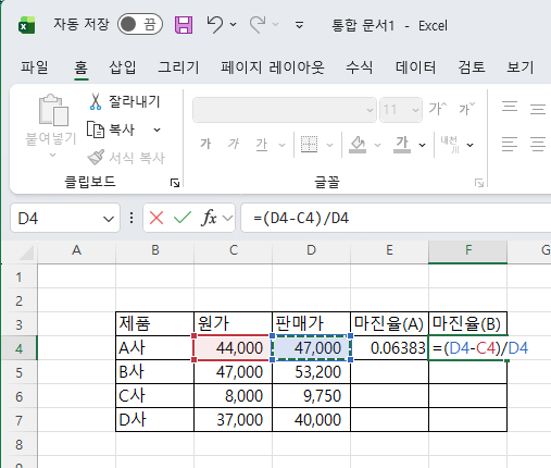 엑셀에서 마진율을 계산할 때 가장 많이 헷갈리는 부분은 어떤 값을 기준으로 나누느냐(분모) 입니다.