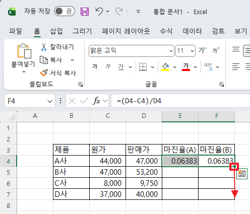 이와 같이 공식을 입력하면 다음과 같이 마진율이 연산이 됩니다. 먼저 연산이 수행된 칸의 가장자리 부분을 선택하시고, 드래그 하여 연산을 하고자 하는 부분까지 선택하여 주십니다.