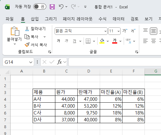 엑셀[Excel] 마진율(마진률) 계산방법, 마진율 공식(마진률)