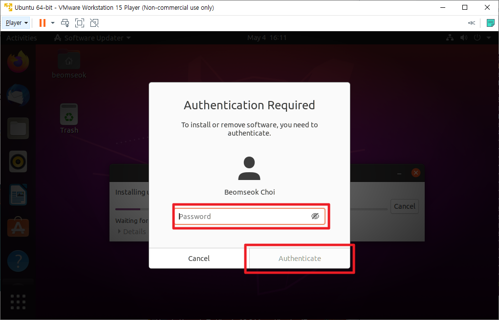 위에서 [Install Now]버튼을 클릭하시면 다음과 같이 인증을 요구 합니다. 그럼 다음부분에서 최초 로그인할 때 사용하는 비밀번호를 입력하여 주시길 바랍니다.