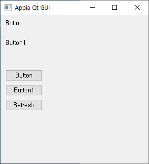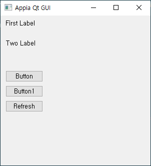 위의 GUI에서 Button을 클릭하면, First Label위치에 Button에 입력된 Button이라는 텍스트가 출력되고, Button1을 클릭하며느 Two Label에 Button1이 출력됩니다. Refresh를 클릭하면, 최초 출력된 First Label, Two Label이 출력이 됩니다.