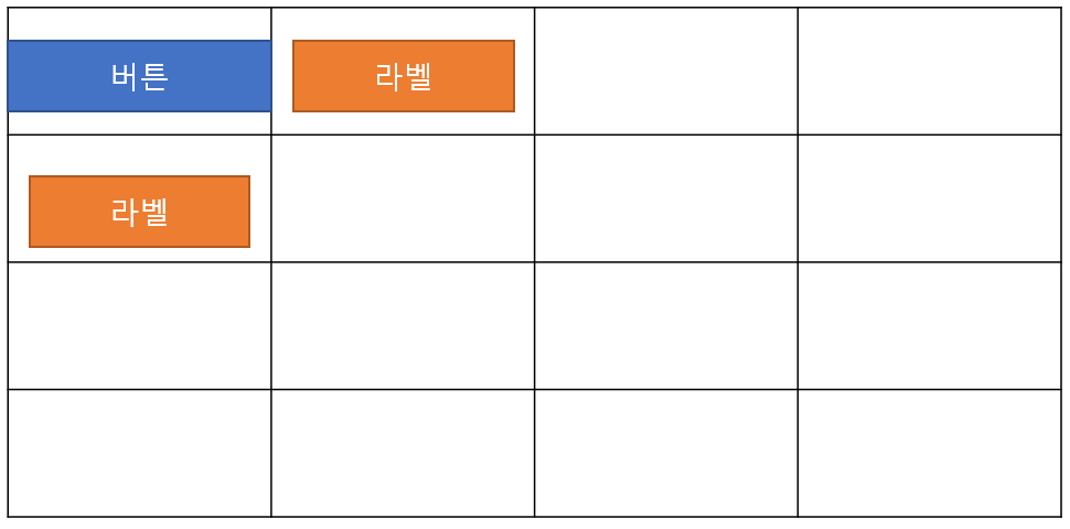 그리드(Grid) 레이아웃을 흔히 말하는 격자형태로 위젯을 쪼개서 나타낸다고 생각하시면 됩니다. 다음 그림을 일단 한번 살펴봐주시길 바랍니다.