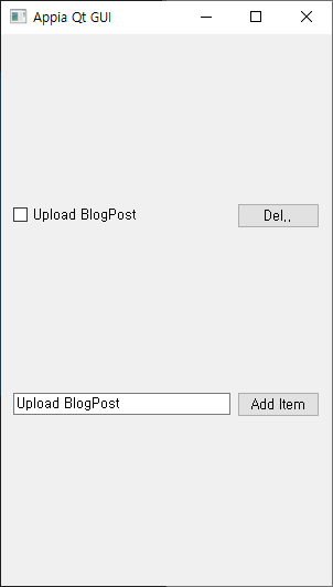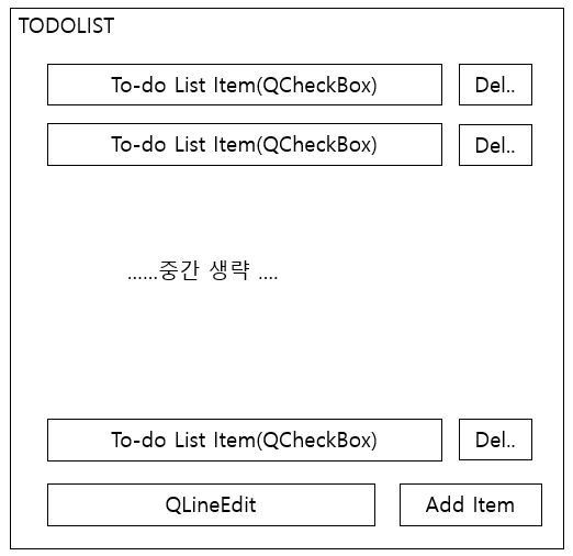 그리고, QLineEdit를 통해서 ToDoList 항목을 입력하고, Add Item(QPushButton)을 통해서 QCheckBox에 하나씩 추가할 예정입니다. 그리고 추가된 To-Do List는 우측에 있는 Del(QPushButton)을 통해서 QCheckBox)을 삭제할 수 있습니다. 이 부분을 조금 정리해보겠습니다.