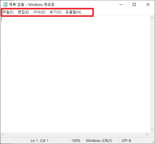 위에서와 같이 메모장에서 상단에 있는 부분을 메뉴바라고 볼 수 있습니다. 그럼 코드 상에서 한번 봐보고 실행을 해보도록 하겠습니다.