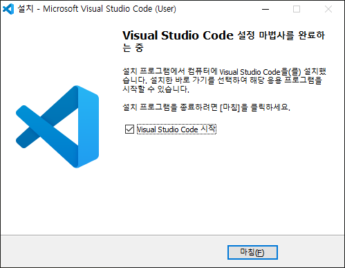 위의 상태까지 끝나면 설치가 완료됩니다. 이 과정에서 Visual Studio Code 시작을 체크하시고 [마침]을 누르시면 VSCODE가 실행이 됩니다.