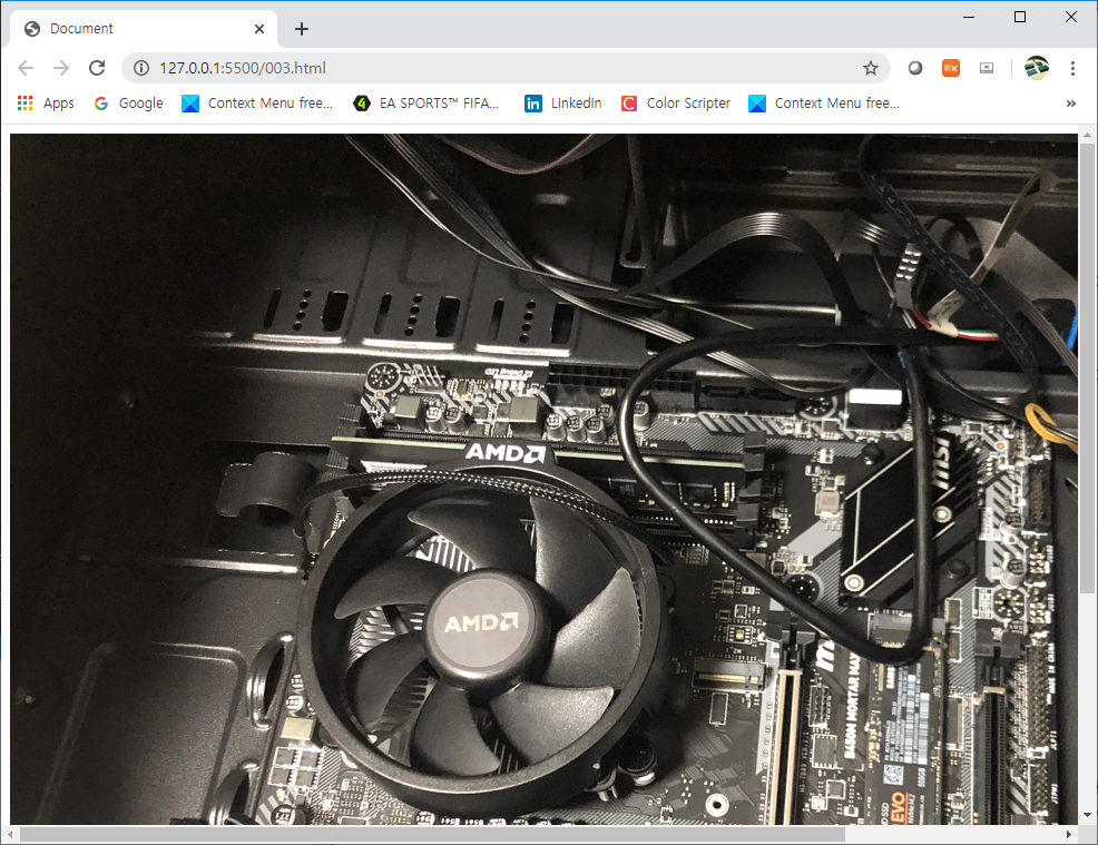 위와 같은 코드를 실행했을 때 다음 화면과 같이 브라우저에 사진이 출력이 됩니다. 위에서 보시는 바와 같이 다음과 같은 형태로 <img> 태그를 사용하면 됩니다.