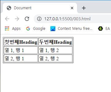 <!DOCTYPE html> <html lang="en"> <head> <meta charset="UTF-8"> <meta name="viewport" content="width=<device-width>, initial-scale=1.0"> <title>Document</title> </head> <body> <table border="1"> <tr> <th>첫번째Heading</th> <th>두번째Heading</th> </tr> <tr> <td>열 1, 행 1</td> <td>열 1, 행 2</td> </tr> <tr> <td>열 2, 행 1</td> <td>열 2, 행 2</td> </tr> </table> </body> </html> | cs |