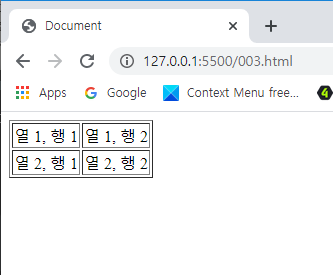 <!DOCTYPE html> <html lang="en"> <head> <meta charset="UTF-8"> <meta name="viewport" content="width=<device-width>, initial-scale=1.0"> <title>Document</title> </head> <body> <table border="1"> <tr> <td>열 1, 행 1</td> <td>열 1, 행 2</td> </tr> <tr> <td>열 2, 행 1</td> <td>열 2, 행 2</td> </tr> </table> </body> </html> | cs |