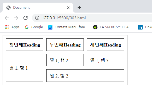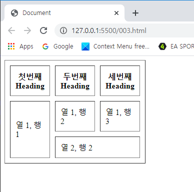 <!DOCTYPE html> <html lang="en"> <head> <meta charset="UTF-8"> <meta name="viewport" content="width=<device-width>, initial-scale=1.0"> <title>Document</title> </head> <body> <table border = "1" cellpadding = "10" cellspacing = "10"> <tr> <th>첫번째Heading</th> <th>두번째Heading</th> <th>세번째Heading</th> </tr> <tr> <td rowspan = "2">열 1, 행 1</td> <td>열 1, 행 2</td> <td>열 1, 행 3</td> </tr> <tr> <td colspan = "2">열 2, 행 2</td> </tr> </table> </body> </html> | cs |