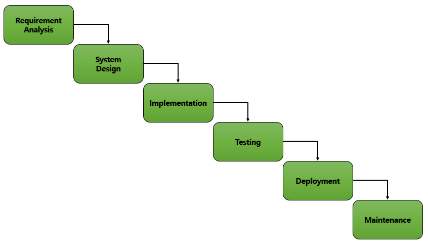 위의 단계들은 앞서 보이는 그림과 같이 계단식으로 진행됩니다. 이 모양이 아래로 계속 흘러가는 것으로 보인다고 해서 폭포수 모델이라고 합니다. 즉, 한 단계가 끝나고 그 다음 단계로 넘어가는 단계입니다. 만약 이전 현재 단계가 완료되지 않을 시에, 그 다음 단계가 진행되지 않습니다. 또한 각 단계를 중첩되지 않는다는 것이 특징입니다.