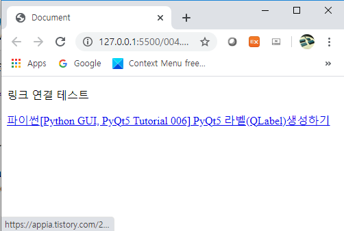 <!DOCTYPE html> <html lang="en"> <head> <meta charset="UTF-8"> <meta name="viewport" content="width=device-width, initial-scale=1.0"> <base href = "https://appia.tistory.com/"> <title>Document</title> </head> <body> <p>링크 연결 테스트</p> <a href = "/278" target = "_self">파이썬[Python GUI, PyQt5 Tutorial 006] PyQt5 라벨(QLabel)생성하기</a> </body> </html> | cs |
