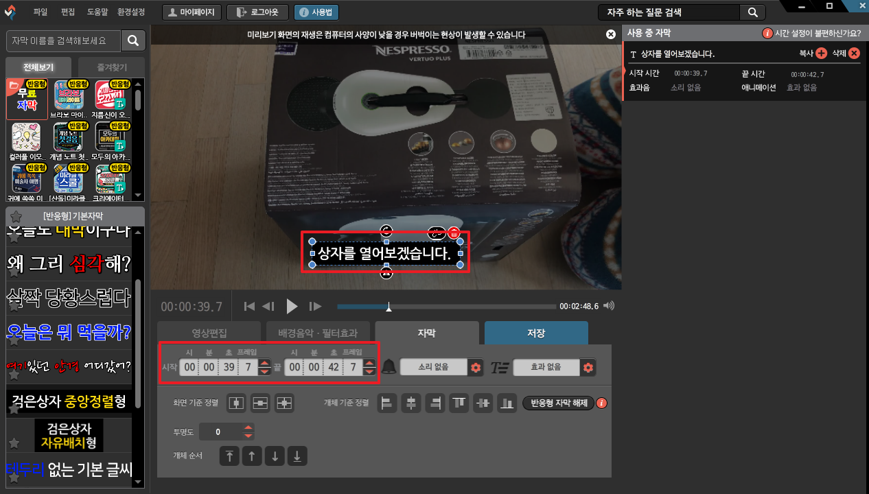 일단 선택하시면 다음과 같이 입력이 됩니다. 동영상 화면에 자막이 나타납니다. 여기에서 원하시는 자막을 입력하시면 됩니다. 그리고, 시작 , 끝 시간을 입력해주시면 됩니다.