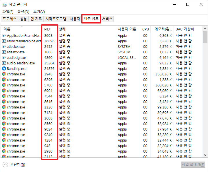 위에서 작업관리자를 실행하면 다음과 같은 그림이 나타납니다. 여기에서 [세부정보]를 클릭하여 주시길 바랍니다. 여기에서 보시면 다음과 같이 PID가 나타난 것을 볼 수 있습니다.