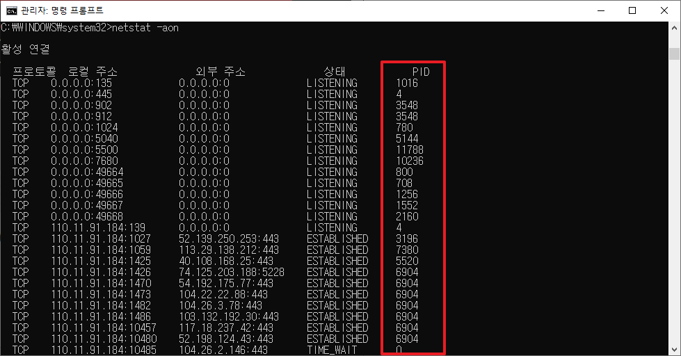 위의 화면에서 보시는 바와 같이 프로토콜 / 로컬 주소 / 내부 주소 / 상태 를 표시하고 그다음 줄의 [Application Name]이 표시 되는 형태입니다. 그럼 다른 형태로 확인이 가능합니다. 여기에 추가로 PID를 토대로 확인이 가능합니다. 그럼 다음과 같은 명령어를 입력하셔야 합니다.