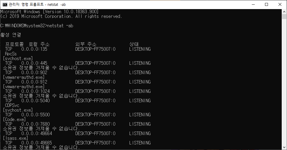 다음과 같은 상태에서 다음 명령어를 통해 현재 PC에서 사용하고 있는 Port와 관련된 Application에 대해서 확인을 할 수 있습니다. 다음 명령어를 입력하셔야 합니다.