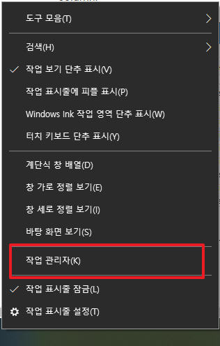 위의 PID가 어떤 부분인지에 대해서 확인을 해보도록 하겠습니다. 그러기 위해서는 작업 표시줄에서 마우스 오른쪽 버튼을 눌러, [작업관리자]를 실행해주시길 바랍니다.