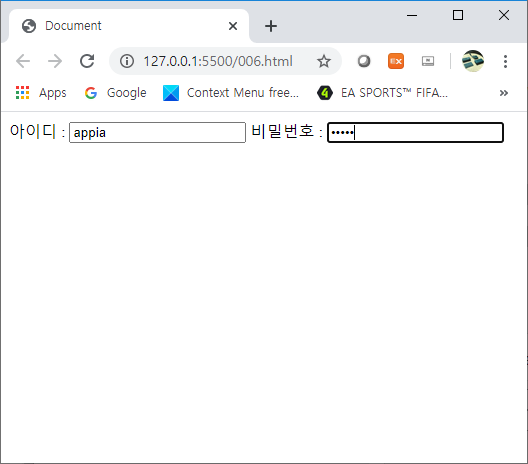 <!DOCTYPE html> <html lang="en"> <head> <meta charset="UTF-8"> <meta name="viewport" content="width=device-width, initial-scale=1.0"> <title>Document</title> </head> <body> <form > 아이디 : <input type = "text" name = "userid" /> 비밀번호 : <input type = "password" name = "password" /><br> </form> </body> </html> | cs |