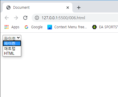 그리고 상기와 같이 기본 선택된 항목에 대해서는 <option value = "Python" selected>파이썬</option>과 같이 selected부분을 추가해주시면 됩니다.