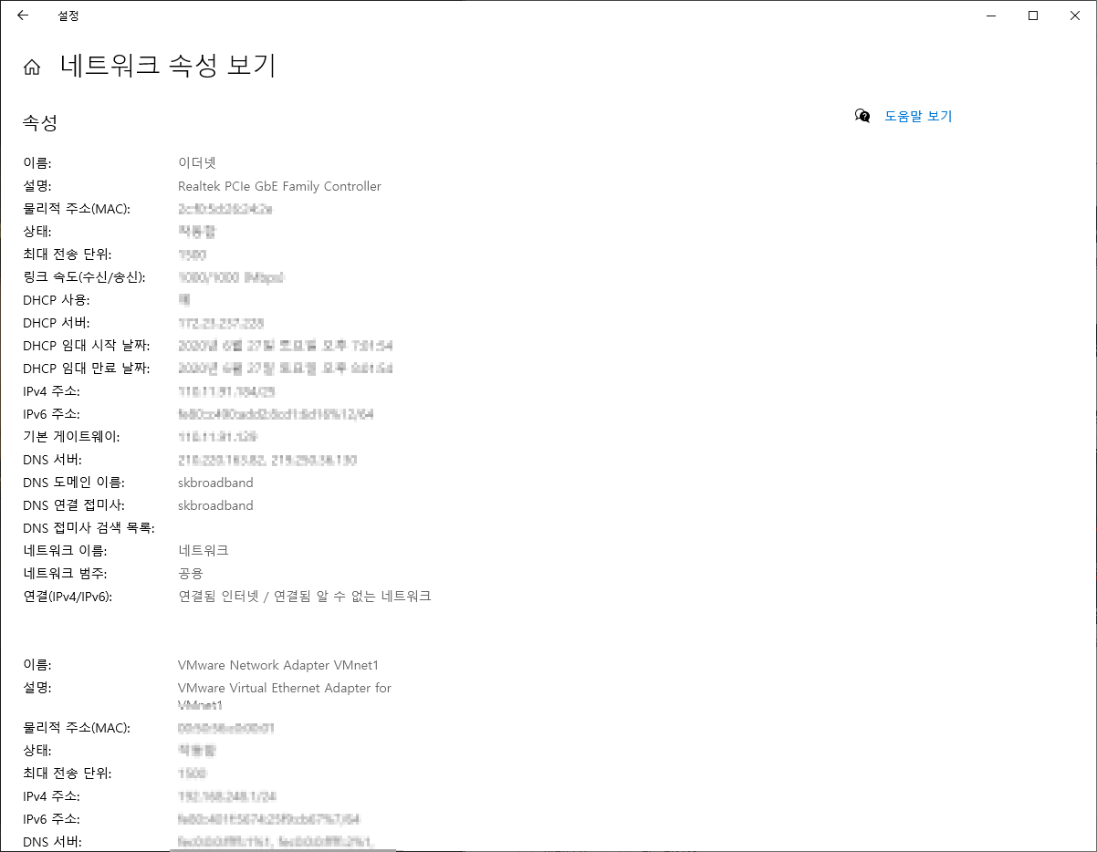 그럼 위와 같이 다양한 정보들을 확인할 수 있습니다. 여기에서 원하시는 IPv4 주소가 원하시는 ip정보입니다. 여기에서 MAC 주소도 확인이 가능합니다. 하지만, 앞선 포스팅의 포스팅 또한 참고하시면 도움이 될것으로 보입니다.
