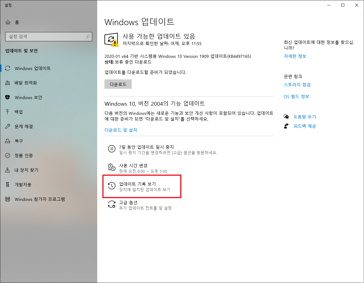 그럼, 다음 화면과 같이 윈도우10(windows10) 업데이트 상황에 대해서 화면과 같이 나타내줍니다. 다음 화면에서 [업데이트 기록보기] 부분을 클릭하여 주시길 바랍니다.