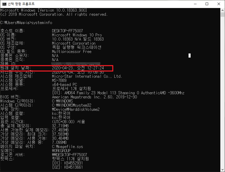 위의 화면에서는 단순히 OS 설치 날짜 뿐 아니라, 호스트 이름 현재 호스트 종류 등에 대해서 상세하게 알 수 있습니다.