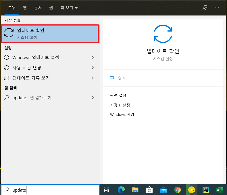 이번에는 윈도우 업데이트가 진행된 최근 날짜를 확인하는 방법에 대해서 살펴보도록 하겠습니다. 우선, 윈도우 메뉴 칸에서 'update'를 입력하시면 다음과 같은 화면이 나타납니다. 여기에서 [업데이트 확인]부분을 클릭하여 주시길 바랍니다.