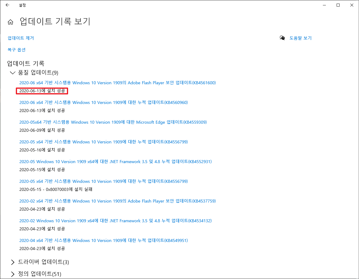 다음 부분을 보시면, 최근에 업데이트 된 기록에 대해서 명시하고 있습니다. 그리고 각 항목에 대해서 항목과 함께 밑에 줄에 설치 날짜를 표시해주고 있습니다.