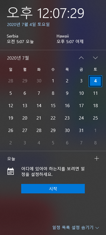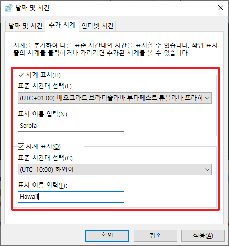 다음과 같은 형태로 세르비아가 포함된 시간/하와이가 포함된 시간을 표시할 수가 있습니다. 이렇게 설정하기 위해서는 몇가지 설정 작업을 진행해 주셔야 합니다.