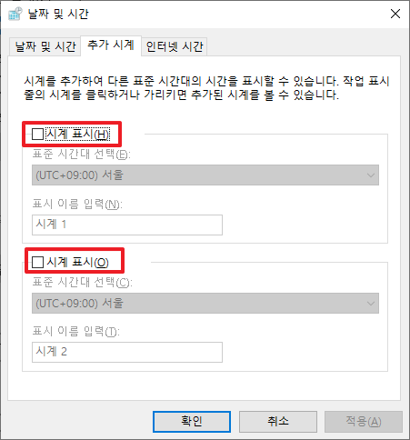 여기에서 [시계 표시] 부분을 클릭하시고, 각각 원하시는 시간대를 추가해주시면 됩니다. 단, 총 2개까지만 추가 가능합니다.