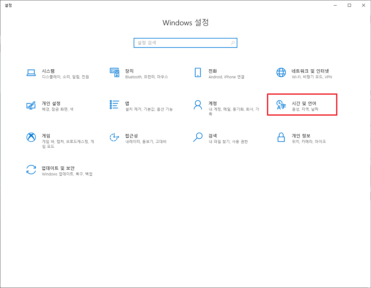 그럼 다음과 같이 윈도우(WIndows) 설정 화면을 나타납니다. 여기에서 [시간 및 언어] 설정 부분을 클리하여 주시길 바랍니다.
