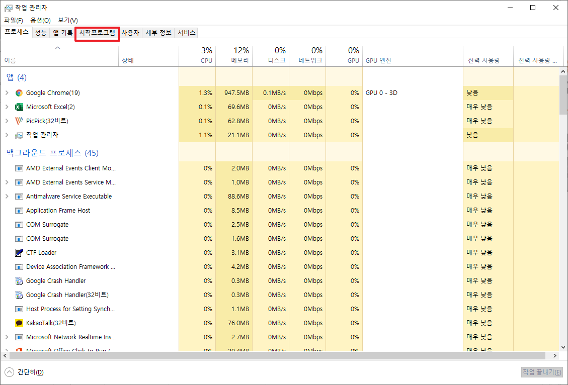 위에서 [작업 관리자]를 실행하면 다음과 같은 화면이 나옵니다. 여기에서 상단에 있는 [시작프로그램]을 클릭하여 주시면 됩니다.