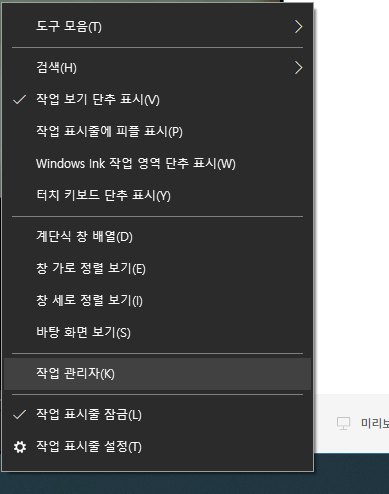 그럼 등록된 시작 프로그래을 활성화 하고, 비활성화 하는 방법에 대해서 살펴보겠습니다. 먼저 작업 표시줄에서 오른쪽 버튼을 누르셔서 작업 관리자를 실행해주시길 바랍니다.