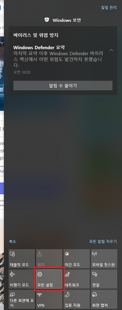 상기 화면에서 알림 관련된 아이콘을 클릭하면, 다음과 같은 화면이 나타날 것입니다. 여기에서 [모든 설정]부분을 클릭하여 주시길 바랍니다.