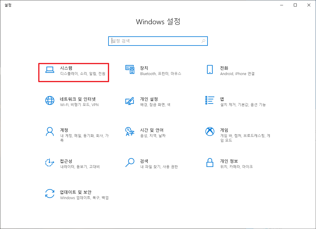 위에서 [모든 설정]을 클릭하시면 다음과 같이 설정 화면이 나타날 것입니다. 그럼, 여기에서 [시스템]부분을 클릭하여 선택해 주시면 됩니다.