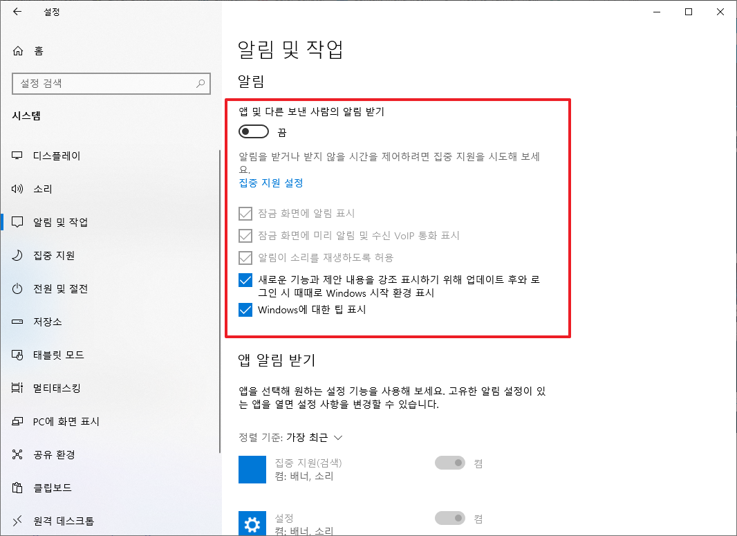 [윈도우10, windows10]프로그램 알람, 시스템 알람 설정하기(켜기/끄기) 본문