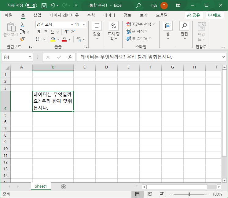 먼저 다음과 같은 '데이터는 무엇일까요? 우리 함꼐 맞춰봅시다.' 라는 텍스트가 있습니다. 이 텍스트는 한눈에 보더라도 한 셀에 다 들어갈 수 없습니다. 그래서, 셀 크기에 맞춰서 자동으로 줄 바꿈을 적용해보도록 하겠습니다.