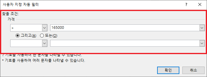 그럼 다음과 같이 기준이 되는 값을 입력할 수 있는 사용자 지정 자동필터 부분이 나타납니다. 여기에서 기준이 되는 값을 입력하여 주십니다.