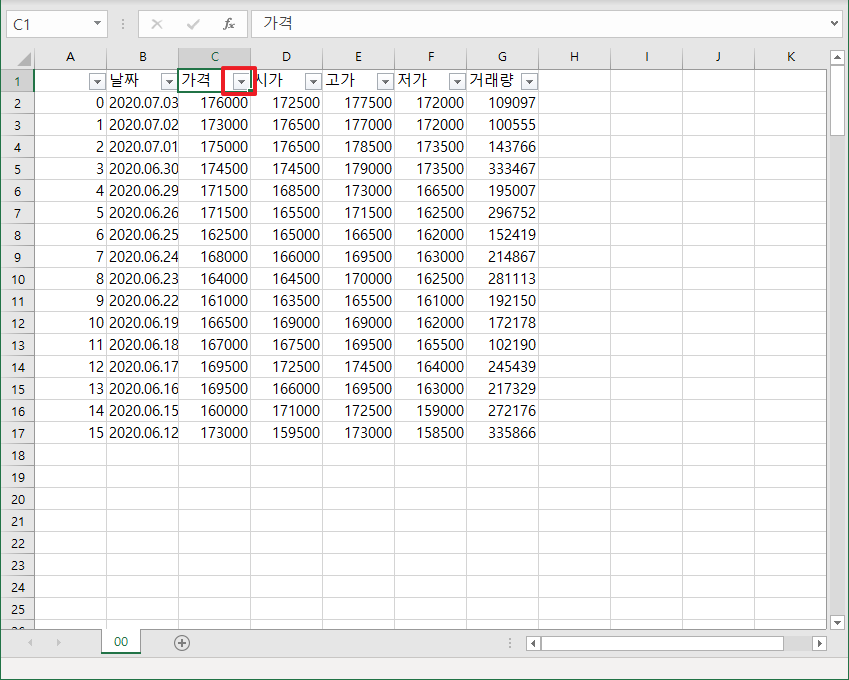 그럼 앞서 과정에서 필터링을 하셨다면, 다음 보이는 부분과 같이 최초 선택한 범위의 행에 아래 화살표 같은 버튼이 달린 것을 보실 수 있을 것입니다. 여기에서 필터링에 기준으로 삼고자 하는 셀에 있는 우측 버튼을 클릭하여 주시길 바랍니다.