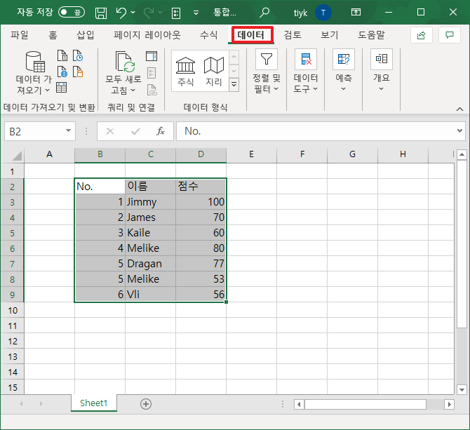 위와 같이 빨간색 부분이 'No.' 부분과 '이름'부분이 중복이 됩니다. 이 부분을 삭제하기 위해서는 먼저, 다음과 같이 범위를 설정해 줍니다. 그런 후에 상단에 보이는 [데이터]탭을 클릭하여 주시길 바랍니다.
