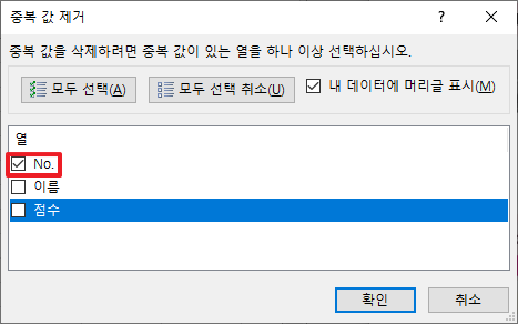 그럼 다음과 같은 다이어로그가 나타날 것입니다. 여기에서 중복 항목으로 여길 Column에 대해서 선택을 해주시면 됩니다. 저의 경우 No.를 선택하여 같은 No.를 가지는 항목에 대해서 삭제를 할 예정입니다. 그러기 위해서 다음 다이어로그에서 'NO.'를 선택하여 주십니다.
