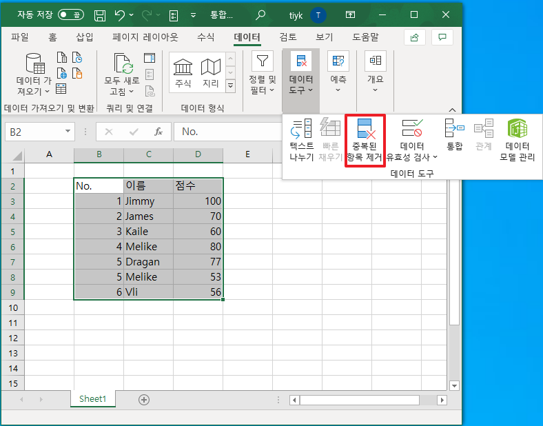 그런 후에 [데이터 도구]를 클릭하여 주십니다. 그런 하위에 포함된 메뉴가 나타날 것입니다. 여기에서 [중복된 항목 제거]를 클릭하여 주시길 바랍니다.