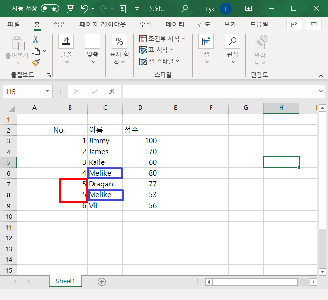 위의 다이어로그에서 [확인]을 클릭하시면 다음과같이 삭제가 됩니다. 즉, 'No.'가 5인 두 항목중에 하나가 삭제됨을 알 수 있습니다.