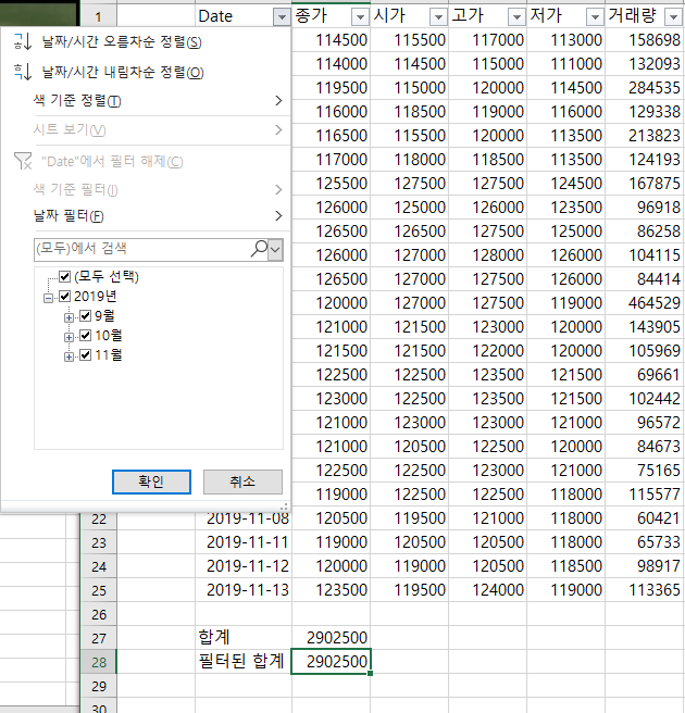 그럼 위에서 Date부분에서 필터 버튼을 클릭하여 특정 월의 대해서만 표시를 할 예정입니다. 여기에서 10월 부분만 클릭하여 10월의 주식 종가의 합계만 구하도록 하겠습니다.