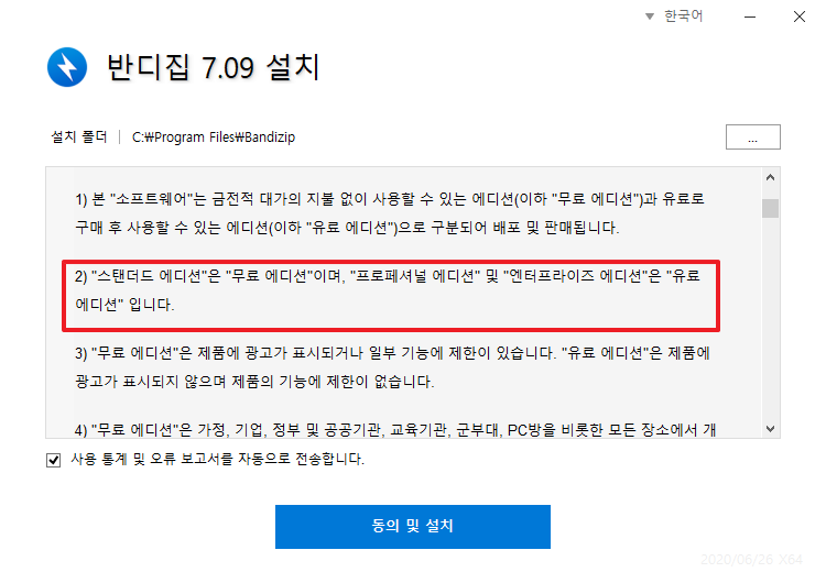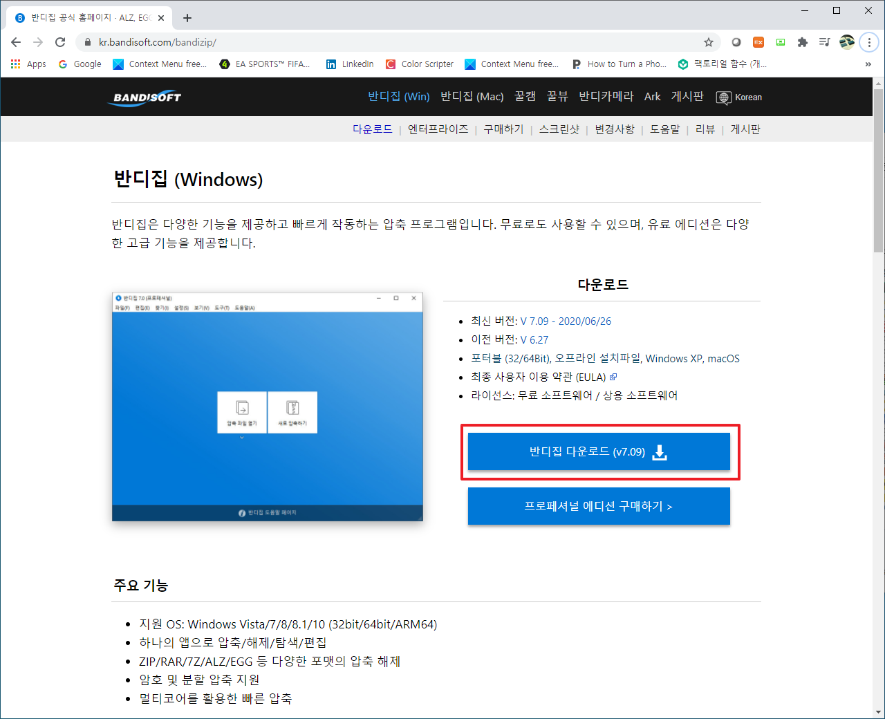그리고 앞서 말씀 드린 바와 같이 반디집은 무료 소프트웨어라는 것을 명시하고 있는 부분에 대해서 다음과 같이 명시하고 있습니다. 앞서 최초 화면에서 프로페셔널 에디션 구매 부분이 있듯이 압축프로그램에 대해서 유료 버전 무료 버전을 별도로 나누어 놓고 있습니다.